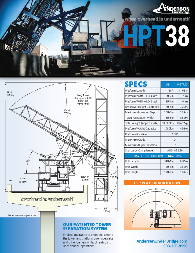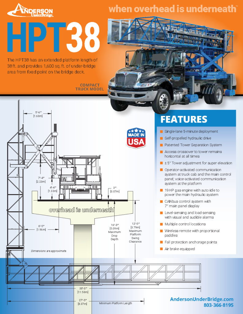 HPT38, our truck-mounted under bridge access unit, comes equipped with enough hardware and capabilities to service more than 1,000 square feet of under bridge area with one deck placement. With its maximum drop depth of 16 ft. 8 in. (5.09 m) and platform extension of 38 ft. (11.58 m), the HPT38 can easily reach across most bridges with two to three lanes of traffic.